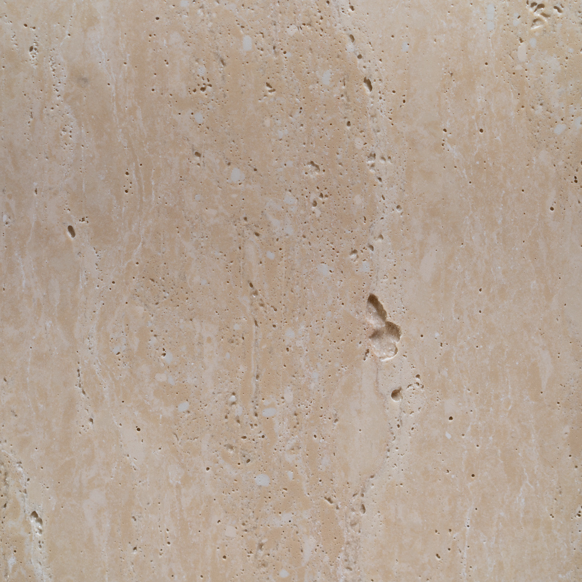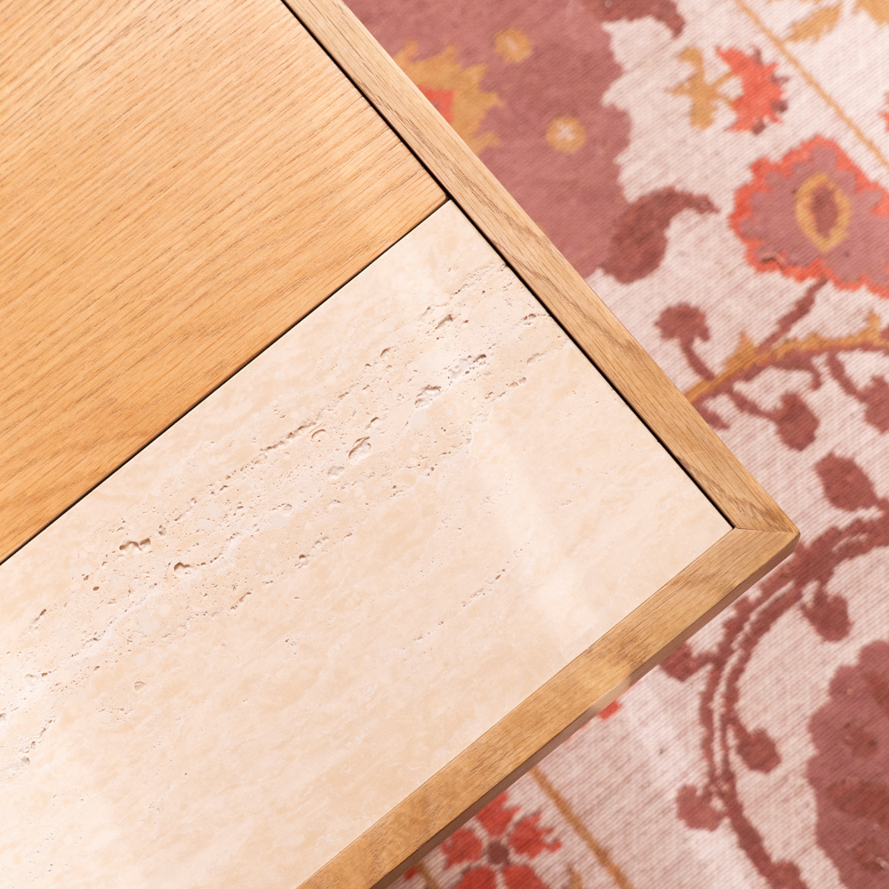 Der Couchtisch verfügt über eine Schicht aus Eichenfurnier. Eichenfurnier strahlt Wärme aus und ist langlebig. Es ist jedoch empfindlich gegenüber Kratzern und Dellen, daher ist es wichtig, den Tisch gut zu schützen. Es empfiehlt sich auch, das Möbelstück nicht direkter Sonneneinstrahlung auszusetzen, da dies die Farbe des Furniers mit der Zeit verblassen lassen kann. Eichenfurnier ist zudem sehr robust – es verzieht sich nicht und bleibt formstabil. Unter der Furnierschicht besteht der Couchtisch aus MDF. Zusätzlich enthält der Tisch ein eingelegtes Travertin-Element.