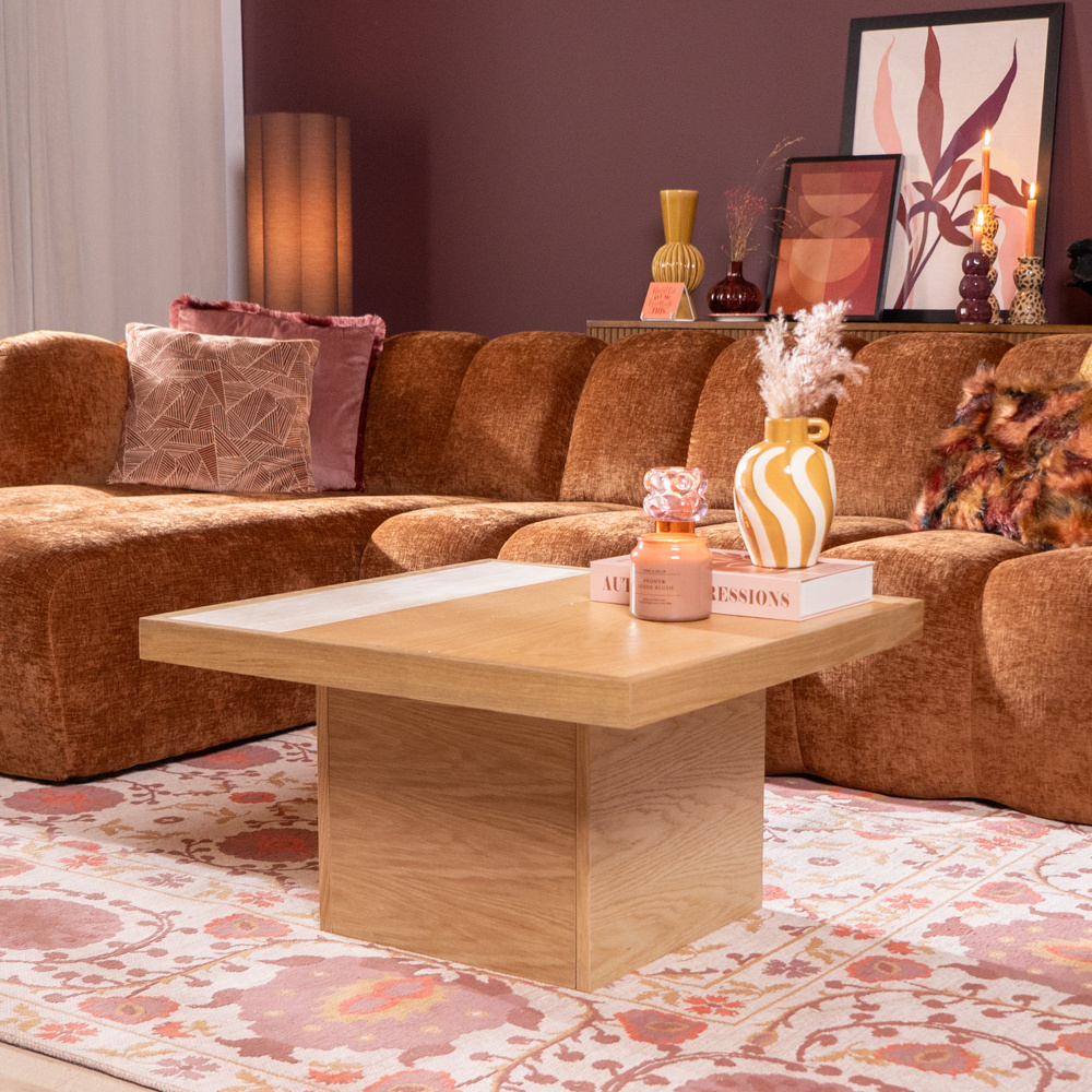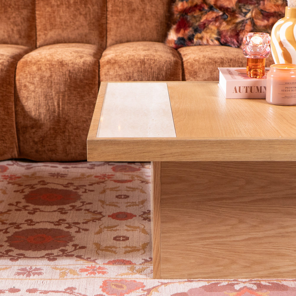 Der Couchtisch Java ist ein stilvoller Mittelpunkt für jeden Raum. Mit seiner quadratischen Form und dem schönen Kontrast zwischen Eichenholz und einem eingelegten Travertin-Element schafft Java eine perfekte Balance zwischen Eleganz und natürlichen Materialien.