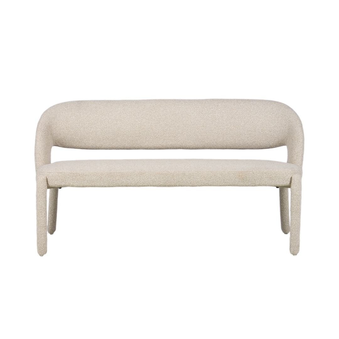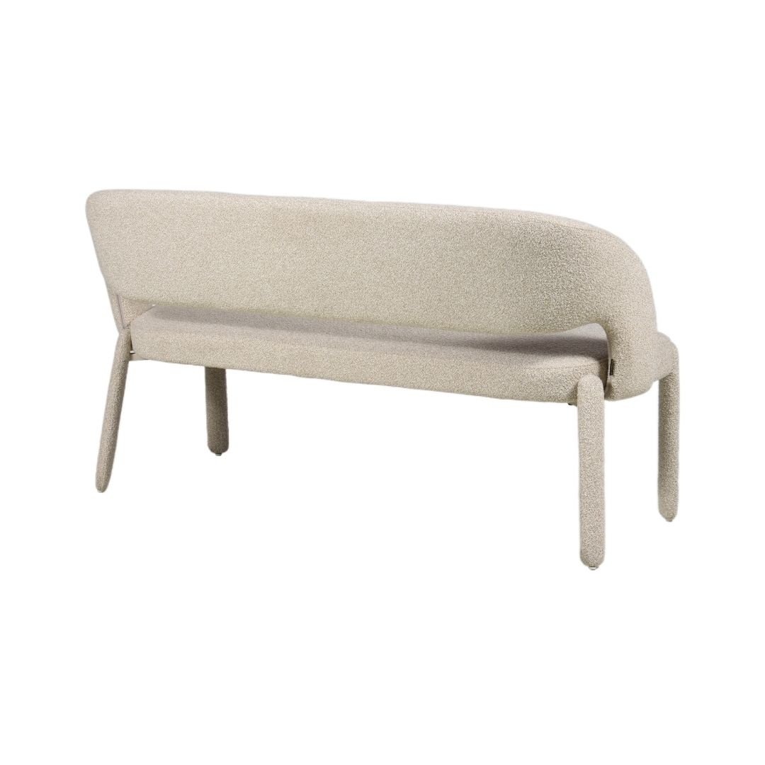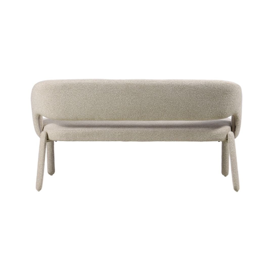 Der hochwertige Bouclé-Stoff mit melierten Garnen sorgt für eine moderne Optik und angenehme Haptik. Vollständig bezogene Beine verleihen der Bank eine besonders luxuriöse Ausstrahlung und das stabile Gestell garantiert langfristige Nutzung und Stabilität.