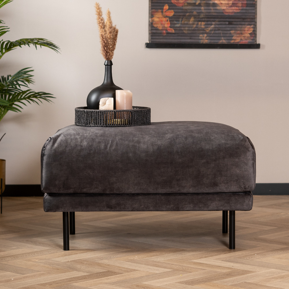 Der vielseitige Hocker Denver ist aus einem wasserabweisenden Samtstoff in der Farbe Anthrazit gefertigt. Außerdem hat der Stoff eine Martindale-Score von 100.000, was bedeutet, dass er sehr langlebig ist. Der Hocker ist mit einem leicht feuchten Tuch leicht zu pflegen.