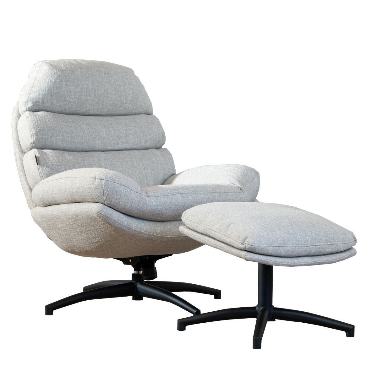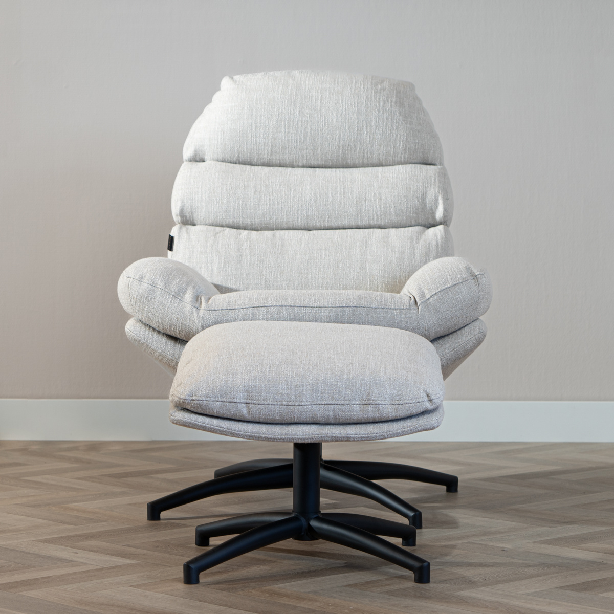 Das Besondere an dem Material dieses Polstersessels ist der 15%ige Leinenanteil neben dem Polyesterstoff. Der Stoff ähnelt einem Boucléstoff und ist wasser- sowie schmutzabweisend. Dadurch ist der Sessel sehr pflegeleicht und lässt sich einfach mit einem warmen, angefeuchtetem Tuch abputzen. Perfekt für Projekteinrichtungen oder Hotels. Das drehbare Gestell ist aus einem mattschwarzen Metall gefertigt. Dieses Modell wird ausschließlich mit dem passenden Fußhocker geliefert.
