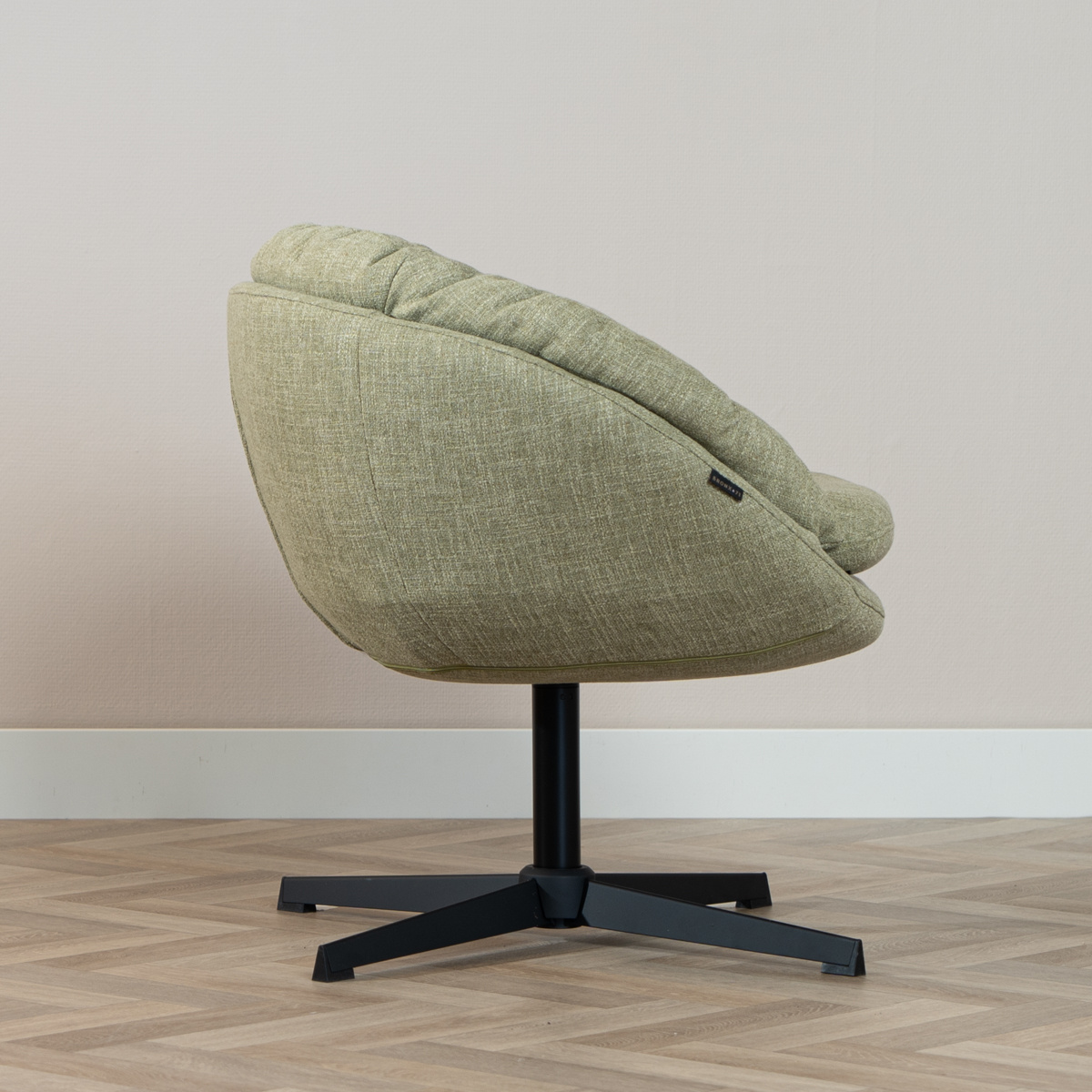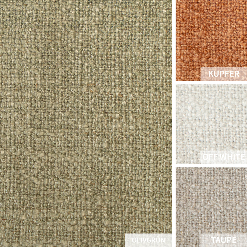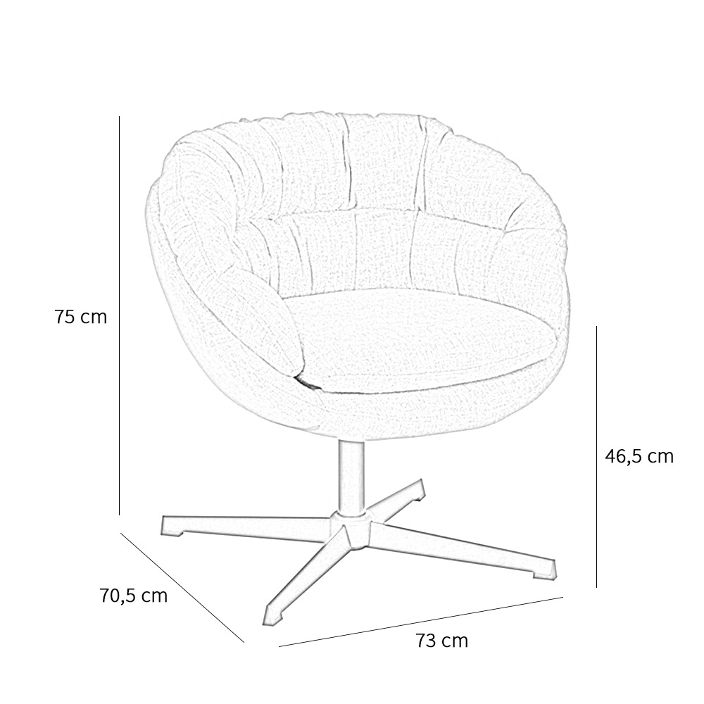 Das Besondere an dem Material dieses runden Polstersessels ist der 15%ige Leinenanteil neben dem Polyesterstoff. Der Stoff ähnelt einem Boucléstoff und ist wasser- sowie schmutzabweisend. Dadurch ist der Sessel sehr pflegeleicht und lässt sich einfach mit einem warmen, angefeuchtetem Tuch abputzen. Perfekt für Projekteinrichtungen oder Hotels. Das drehbare Gestell ist aus einem mattschwarzen Metall gefertigt.