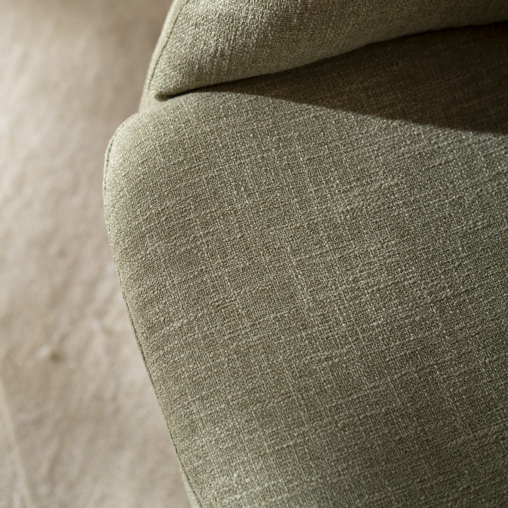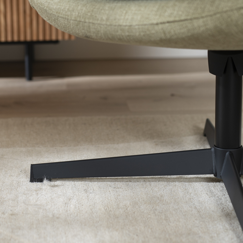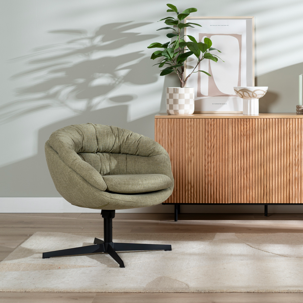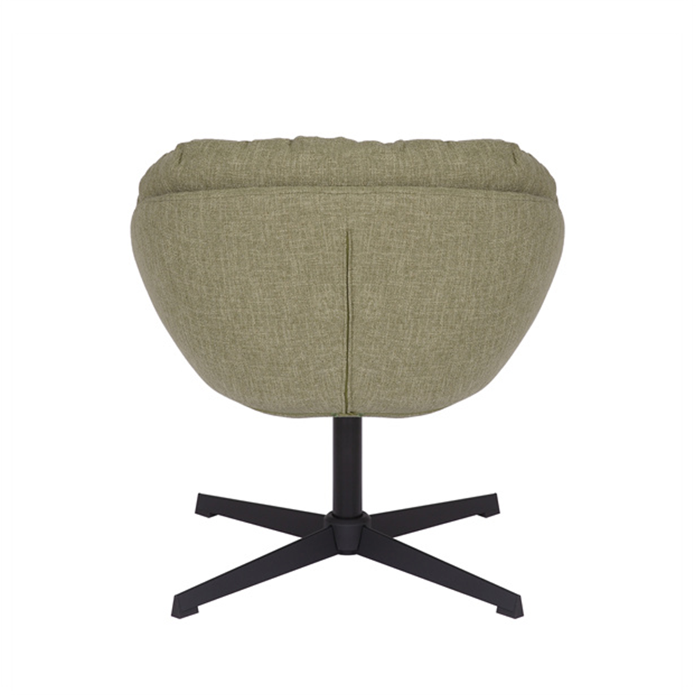 Das Besondere an dem Material dieses runden Polstersessels ist der 15%ige Leinenanteil neben dem Polyesterstoff. Der Stoff ähnelt einem Boucléstoff und ist wasser- sowie schmutzabweisend. Dadurch ist der Sessel sehr pflegeleicht und lässt sich einfach mit einem warmen, angefeuchtetem Tuch abputzen. Perfekt für Projekteinrichtungen oder Hotels. Das drehbare Gestell ist aus einem mattschwarzen Metall gefertigt.