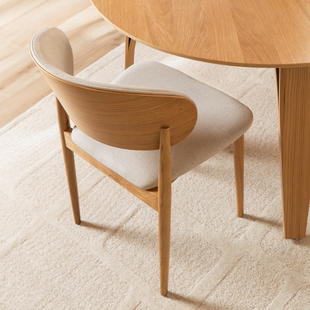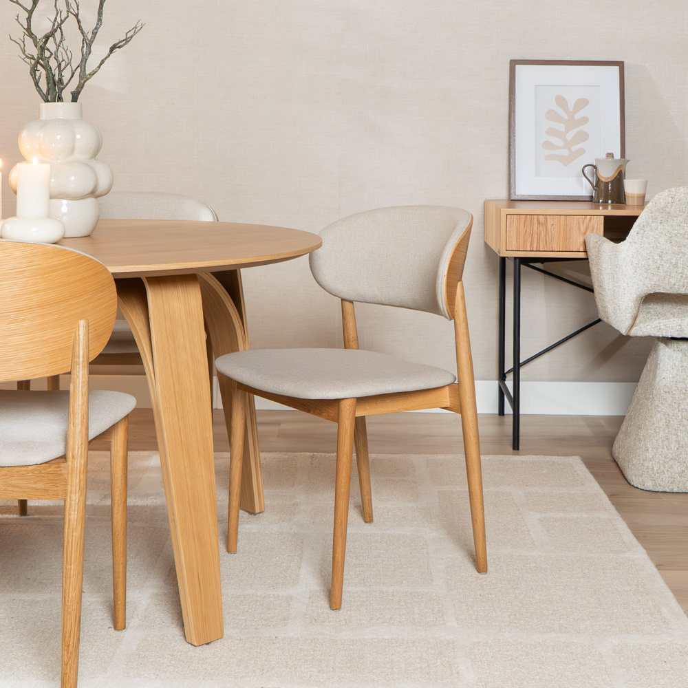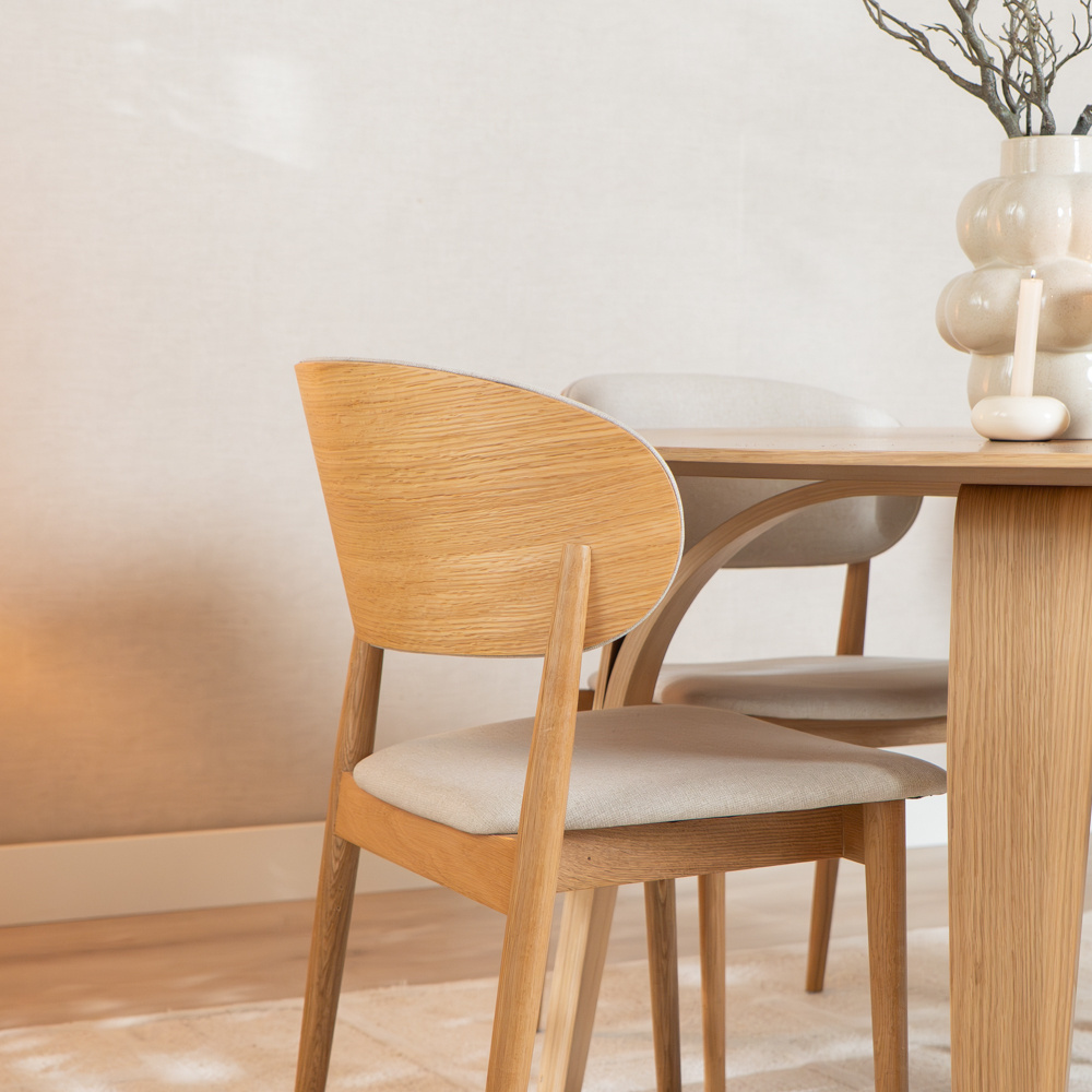 Der Stuhl verfügt über eine Schicht Eichenfurnier. Diese lässt sich leicht mit einem leicht feuchten Tuch reinigen. Zudem wird empfohlen, regelmäßig den Foam Cleaner zu verwenden, um das Produkt optimal zu erhalten. Es wird nicht empfohlen, Möbelstücke mit Eichenfurnier direktem Sonnenlicht auszusetzen, da dies die Wahrscheinlichkeit von Farbveränderungen und dem Verblassen der Furnierschicht erhöht. Das Gestell besteht aus 100 % massivem Eichenholz. Bitte beachten Sie: Der helle Stoff ist empfindlicher gegenüber Flecken, lässt sich jedoch gut pflegen und reinigen mit unserem Textil Care & Clean Kit.