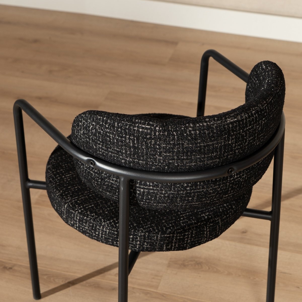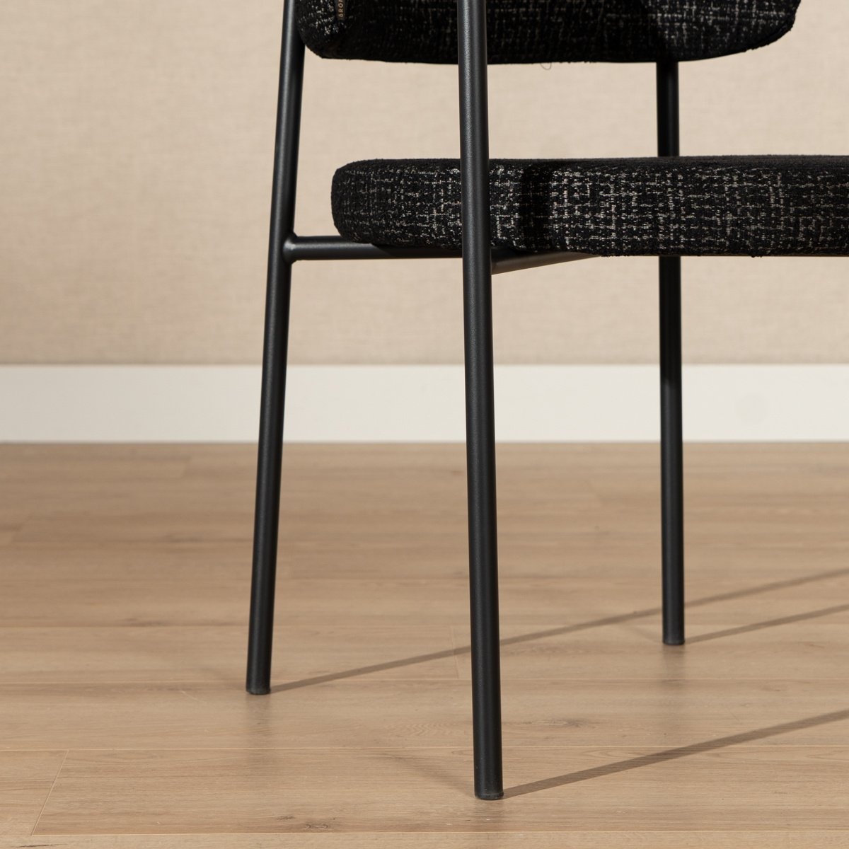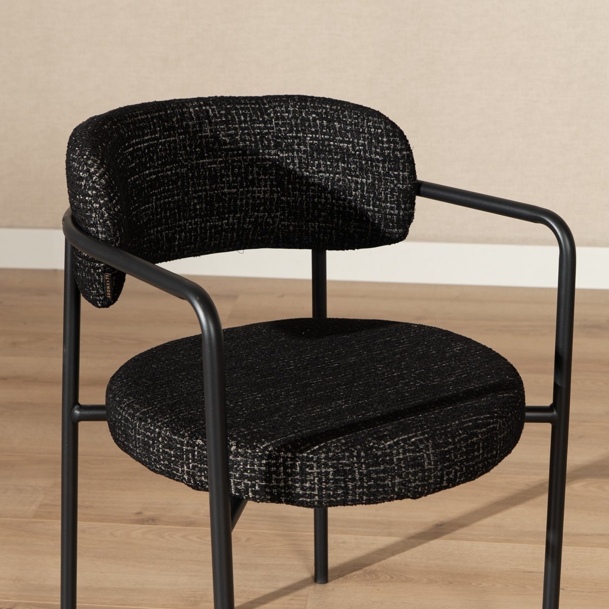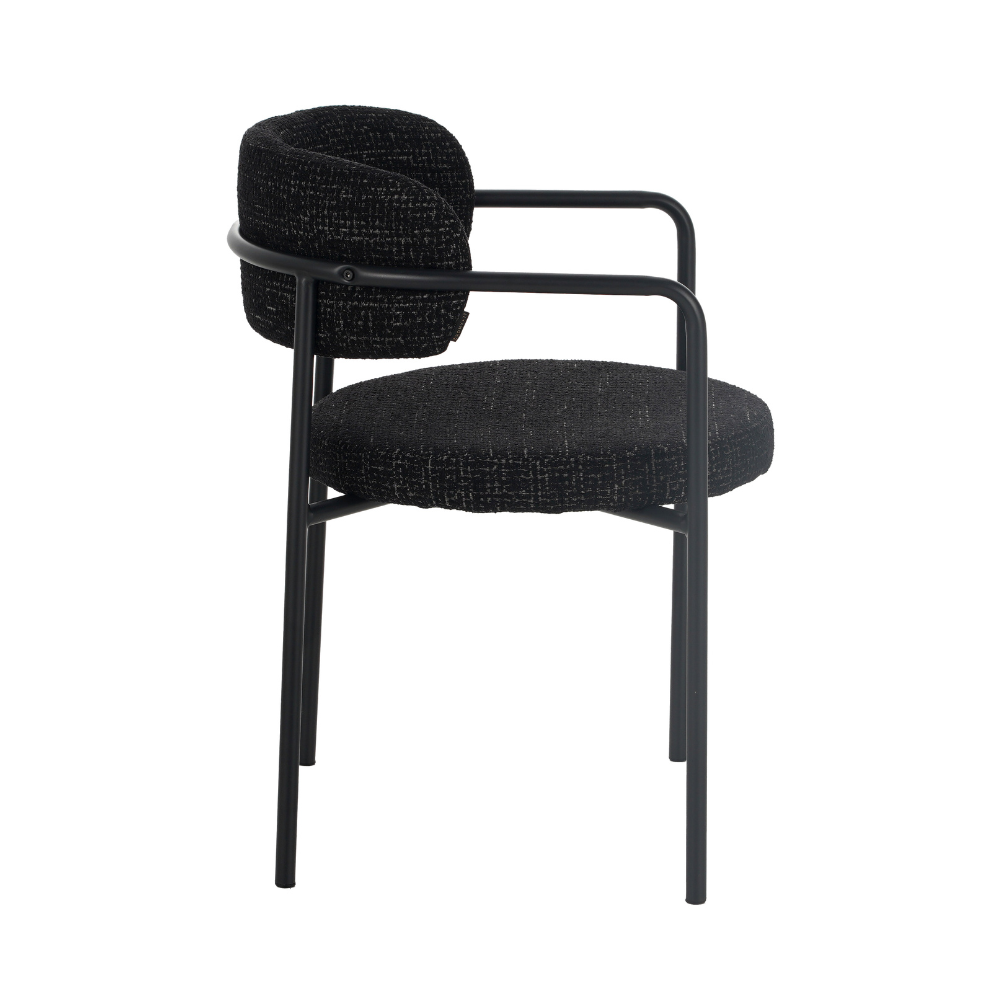 Die Armlehnen und die runde Rückenlehne sorgen bei Stuhl Nicky für hohen Komfort. Das schwarze Gestell in Kombination mit dem melierten Stoff verleiht dem Stuhl eine stilvolle Ausstrahlung.