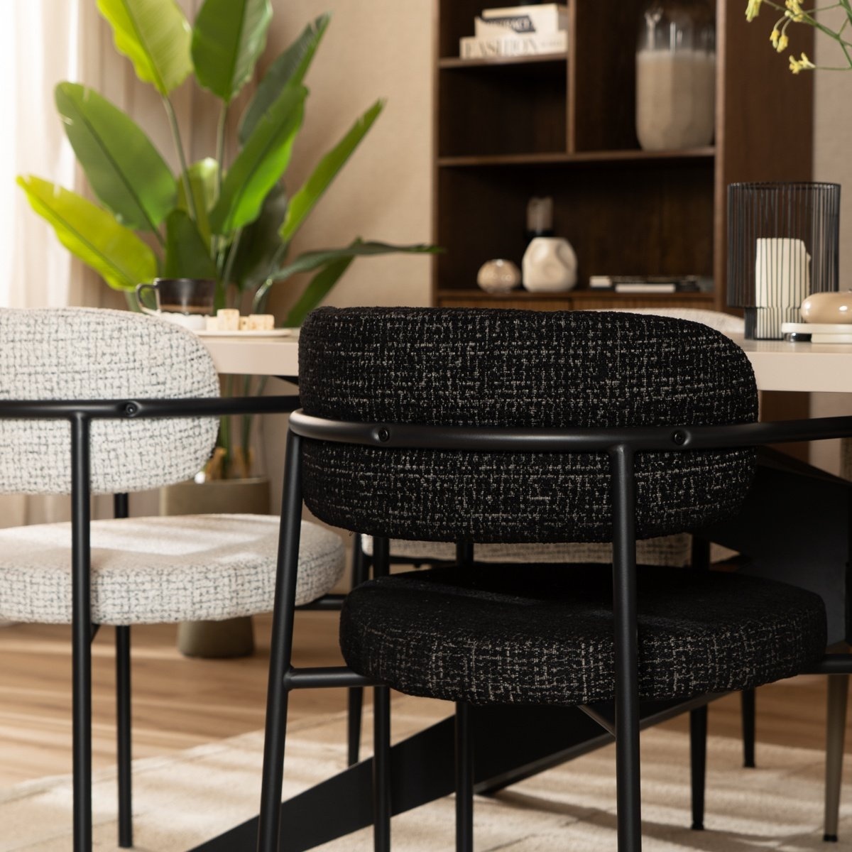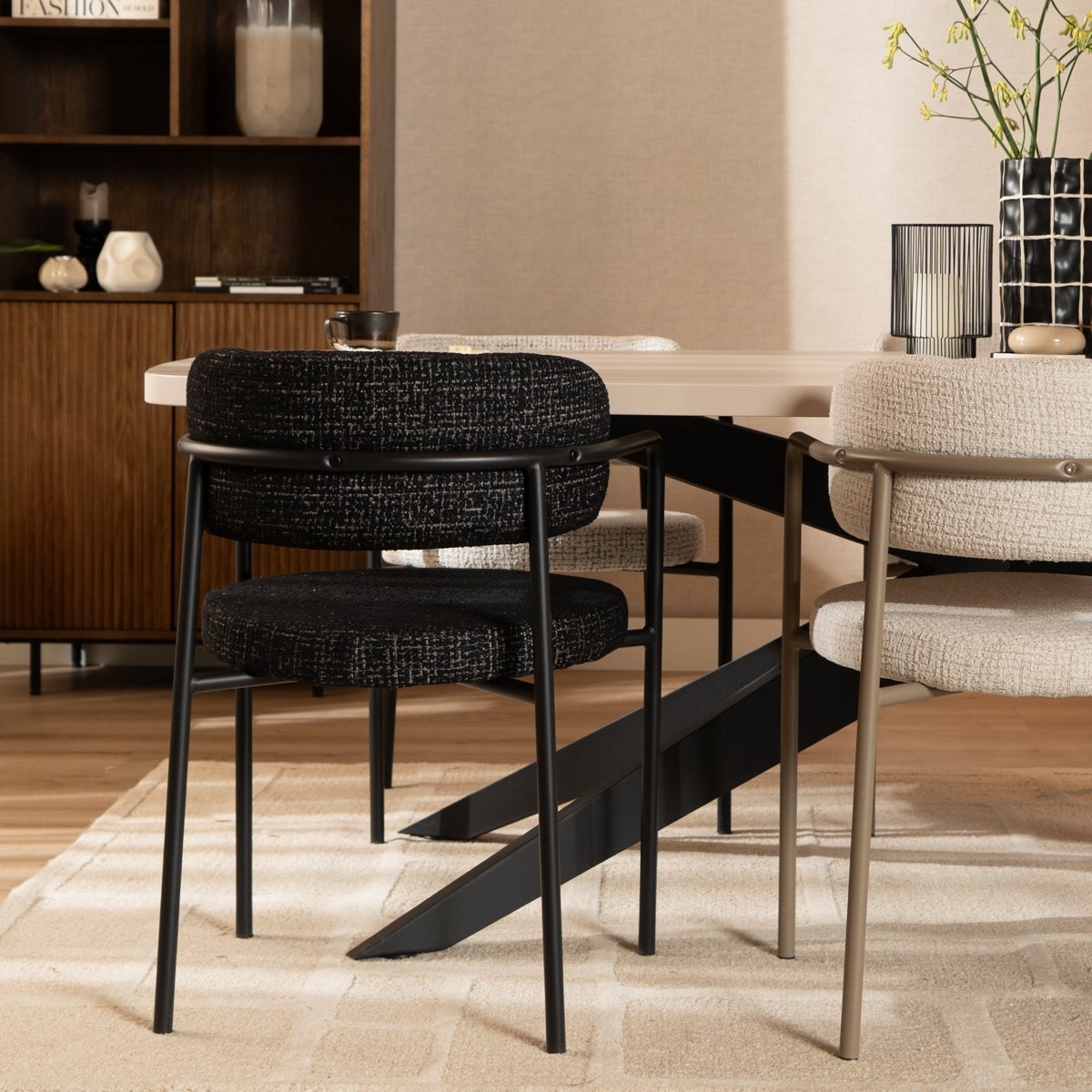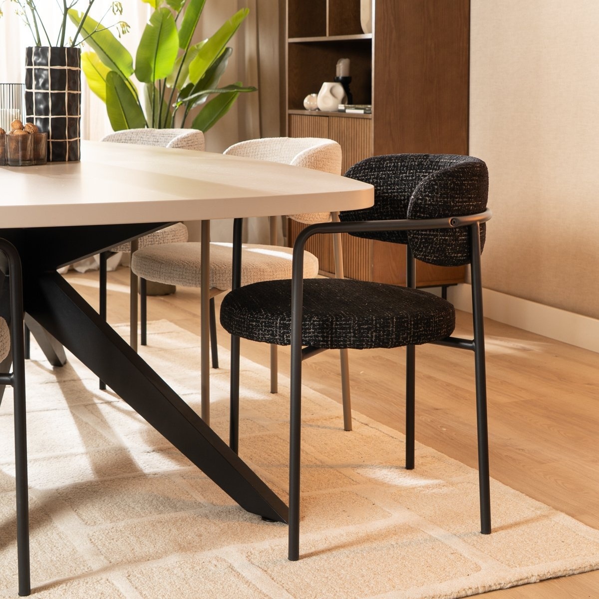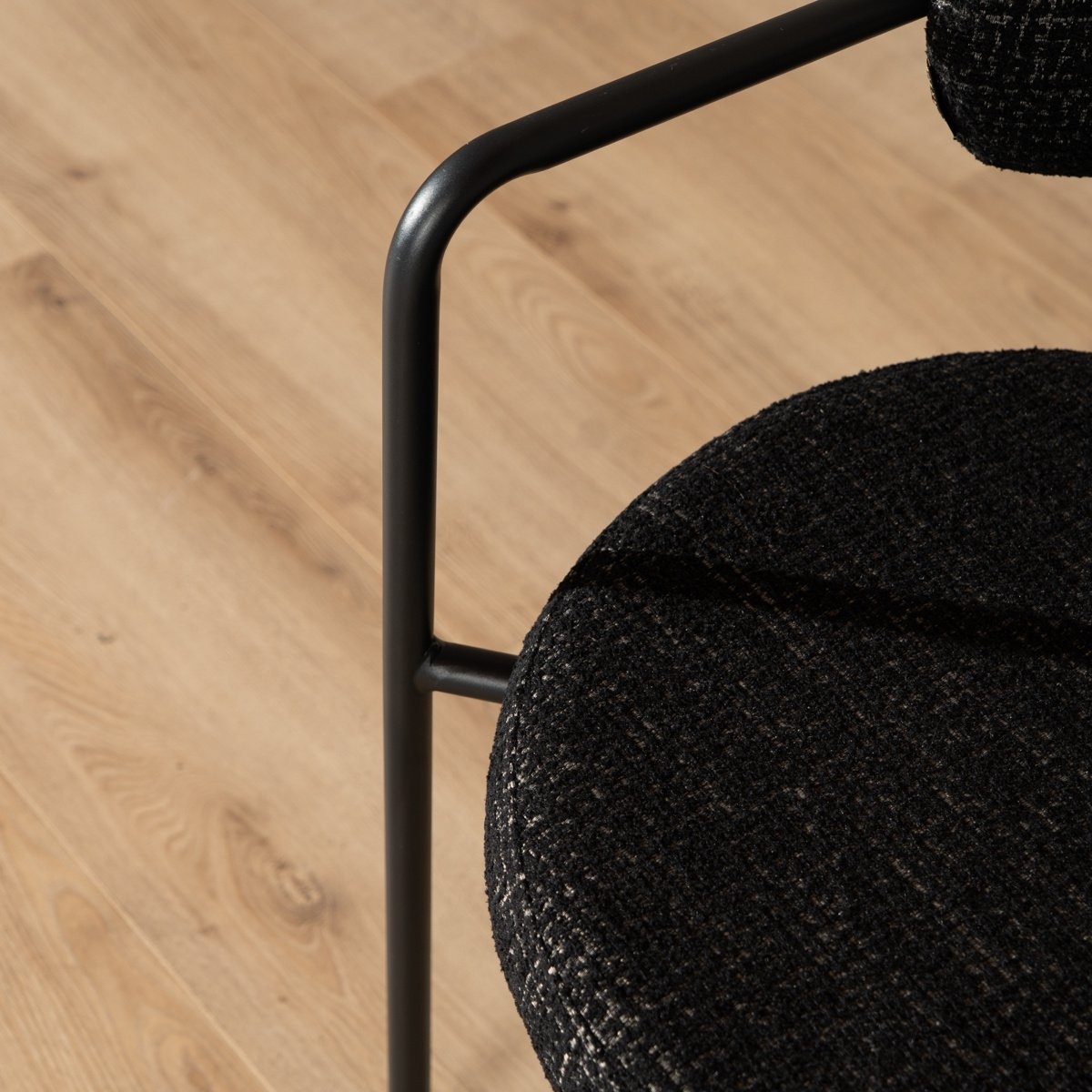 Die Armlehnen und die runde Rückenlehne sorgen bei Stuhl Nicky für hohen Komfort. Das schwarze Gestell in Kombination mit dem melierten Stoff verleiht dem Stuhl eine stilvolle Ausstrahlung.