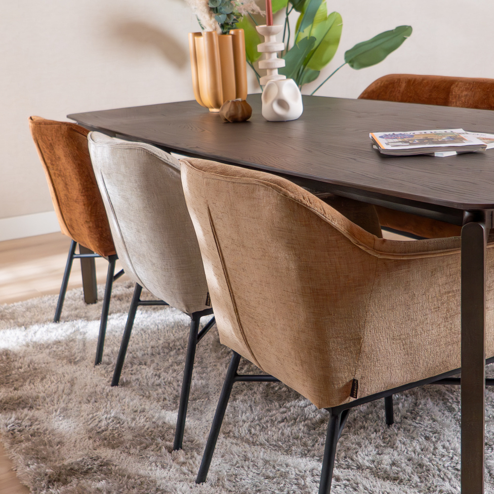 Der Stuhl verfügt über ein extra verstärktes Metallgestell und ist mit strapazierfähigem, wasserabweisendem Chenille bezogen. Der Sitz bleibt frisch und sauber, die Pflege ist einfach: regelmäßig mit einem feuchten Tuch oder einem Textil Care Kit reinigen. Der Eddy-Stoff ist ein komfortabler Chenille-Stoff aus 100 % Polyester. Dieser Stoff hat einen Martindale-Wert von 60.000, was ihn äußerst langlebig und für intensive Nutzung geeignet macht. Der Stoff fühlt sich weich an und wirkt luxuriös, was zum angenehmen Sitzkomfort beiträgt.