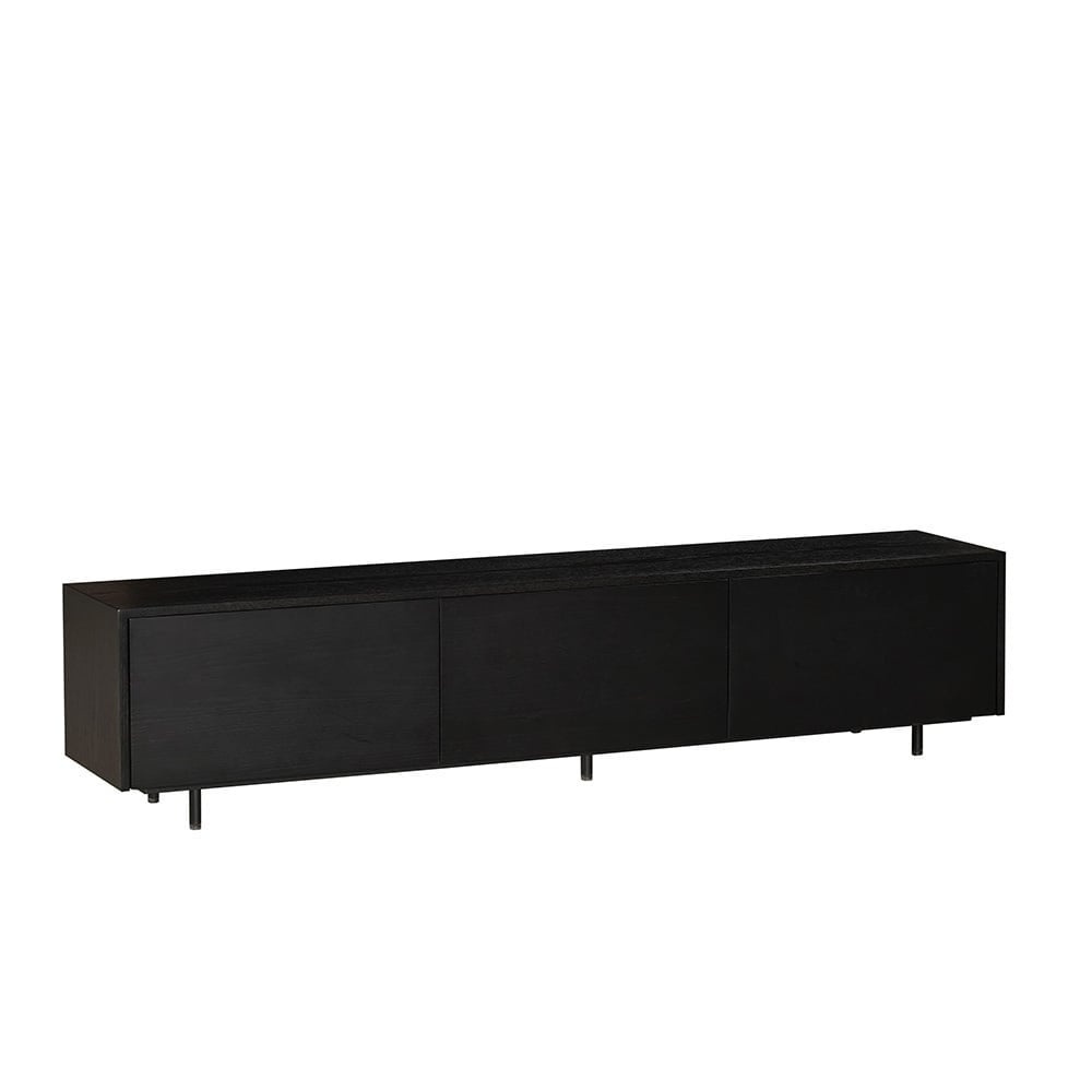 Das TV-Lowboard Thomas hat die Maße 180x36x45 cm und ist aus hochwertigem Rubberwood, auch Gummibaumholz oder Kautschukholz genannt, gefertigt und mit dünnem Eichenholz beklebt. Dieses Holz ist unempfindlich gegenüber Feuchtigkeit, sodass es eine gute Alternative zum klassischen Holz ist. Somit ist es nicht so schlimm, wenn versehentlich eine Flüssigkeit auf das Lowboard verschüttet wird. Sie können das Lowboard einfach mit einem trockenen Tuch reinigen. Das Gestell des Sideboards ist aus schwarzem pulverbeschichtetem Metall gefertigt, wodurch die Kommode sehr stabil ist.