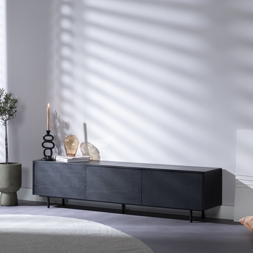 Der TV-Schrank Thomas ist aus Rubberwood mit Eichenholz, welches dem Fernsehschrank einen rustikalen Look verleiht. Mit den drei Soft-Close Türen bietet die TV-Kommode viel Stauraum für die Gegenstände Ihrer Gäste. Die Türen haben ein schlichtes Design, sodass der TV-Schrank aus Holz zu nahezu jeder Einrichtung passt. Auf der 180 cm breiten Oberfläche haben Sie genug Platz für Ihren Fernseher und Accessoires, somit ist der TV-Schrank ideal für ein Hotelzimmer oder eine Ferienwohnung. Das Lowboard kann jedoch auch im Büro als Schrank genutzt werden. Der TV-Schrank Thomas ist somit in jeder Einrichtung ein Must-have.