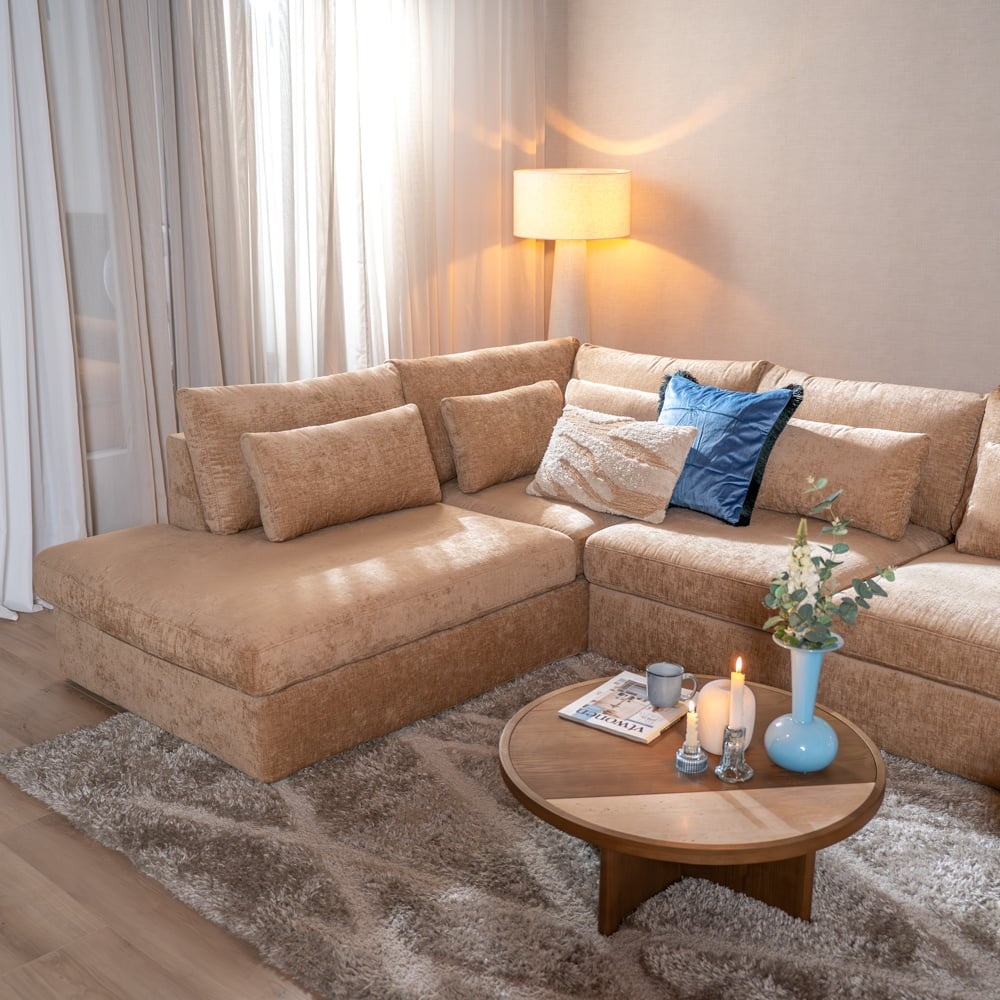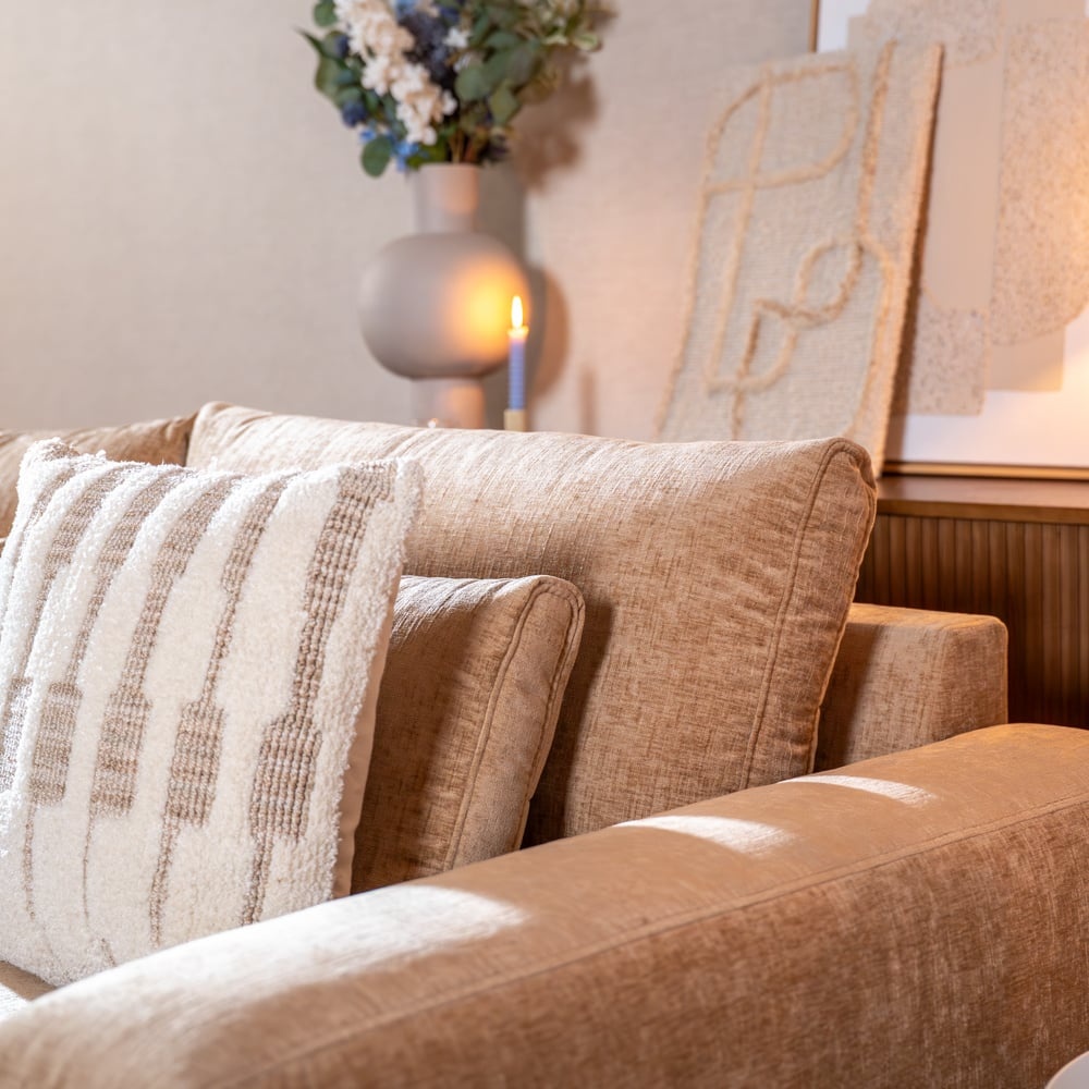 Die U-Form-Bank Kyle ist mit Eddy Chenille bezogen, einem hochwertigen Stoff aus 100 % Polyester, wasserabweisend und nach REACH- sowie OEKO-TEX-Standards zertifiziert. Chenille zeichnet sich durch eine volle, weiche Struktur aus und bietet besonderen Sitzkomfort. Der Stoff hat einen Martindale-Wert von 60.000, was bedeutet, dass das Sofa extrem langlebig und für intensive (tägliche) Nutzung geeignet ist. Das Sofa ist mit einer wasserabweisenden Oberflächenbeschichtung versehen, sodass Flüssigkeiten nicht sofort eindringen und leicht entfernt werden können.